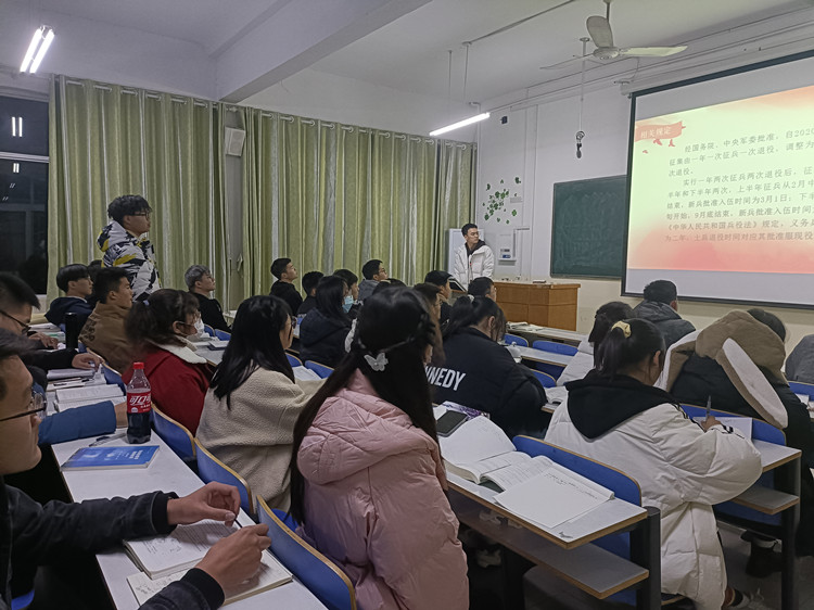 为增强大学生依法履行兵役义务的意识,推动加拿大28平台 大学生征兵工作,确保高标准高质量完成本年度大学生兵员征集任务。12月14日,加拿大28平台 在教二梯四、教三05、教三06开展大学生应征入伍宣传动员工作。此次宣传动员工作由赵自依主持,徐庚琛主讲。